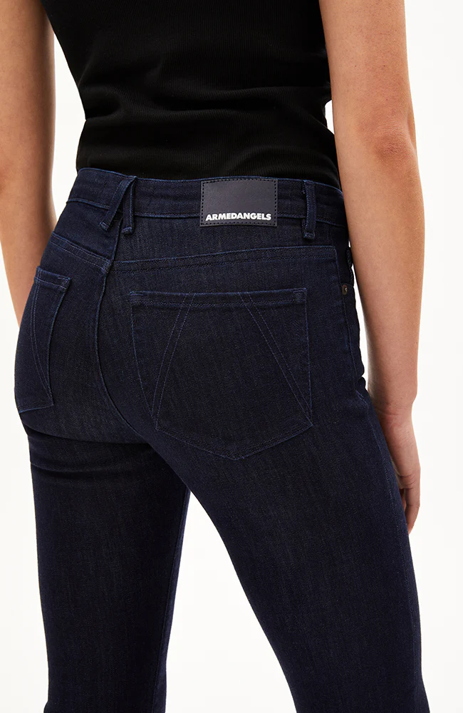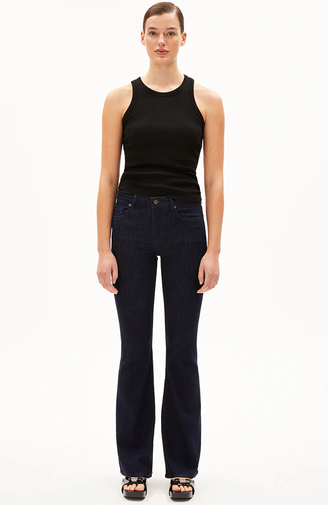 De bestseller van vorig jaar is terug! De Anamaa flared jeans van ARMEDANGELS heeft een mid-waist model en heeft een tijdloze denim blauwe kleur (dark cyanic).
