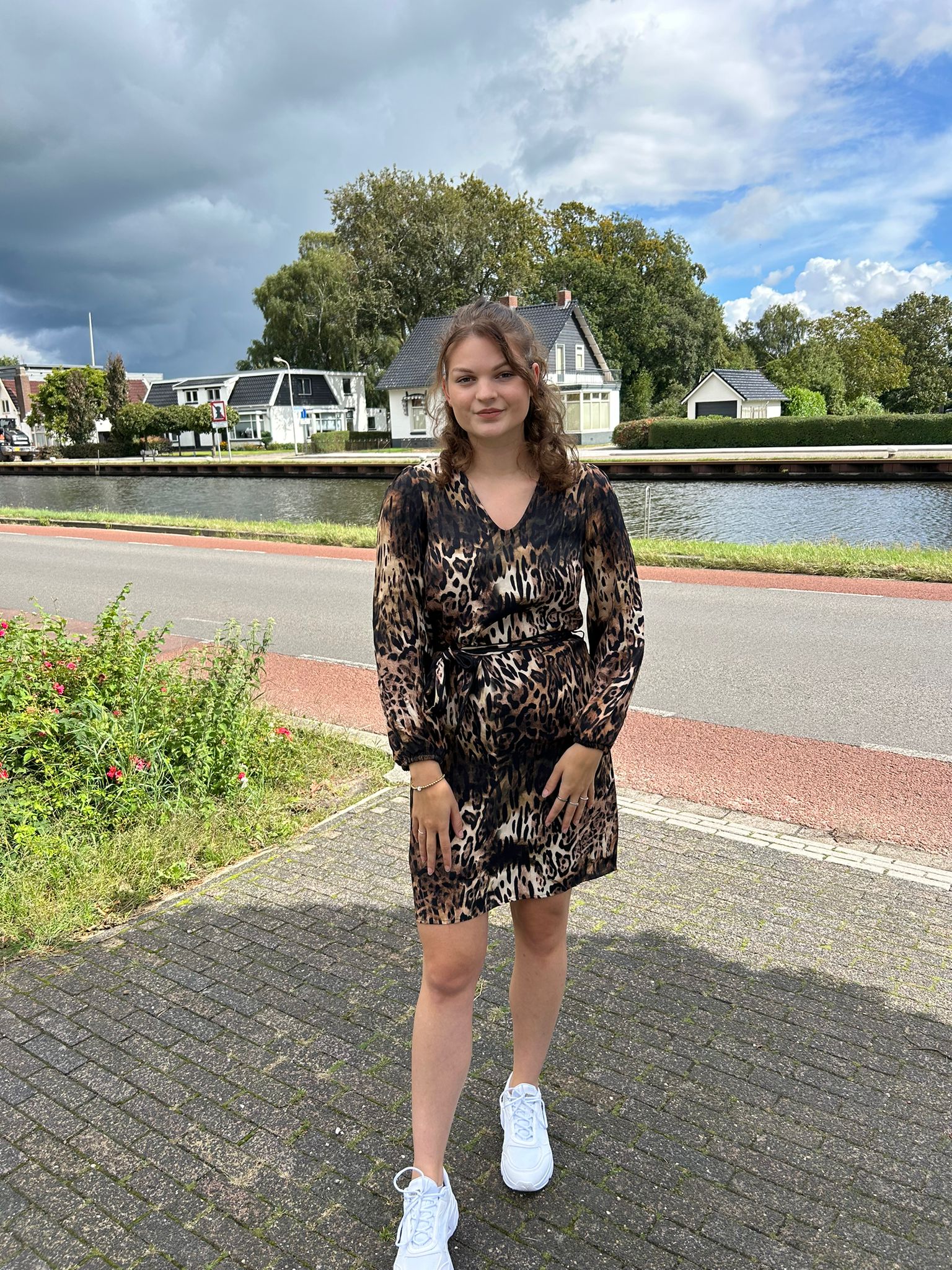 Van Elvira is deze Jurk binnen de Jurk heeft een strik ceintuur aan de voorkant lange mouw en een v-hals. De jurk valt op de knie en heeft een mooie print in bruin zwart en beige.