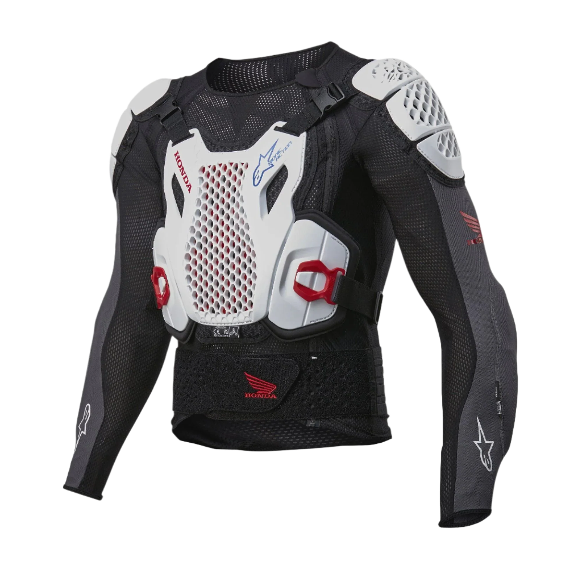 De Honda Bionic Plus V2 Protection Jacket is sterk geventileerde beschermende bepantsering met ergonomische en flexibele celtechnologie, speciaal ontworpen voor off-road rijden. De ultralichte Honda Bionic Plus v2 Protection Jacket biedt uitstekende bescherming van het bovenlichaam tegen schokken. De beschermende bepantsering beschikt over de geheel nieuwe Level 2 CELL Technology borstbeschermer voor ultralicht gewicht en superieure luchtstroom en ventilatie, evenals de super-geventileerde Level 2 Nucleon CELL en Flex Hybrid Technology rugbeschermer die ergonomisch is ontworpen voor een verbeterde adaptieve pasvorm. Zowel de voor- als achterbeschermers zijn gemonteerd op ademend schuimrubber voor een veilige en comfortabele pasvorm. De open rasterstructuur van de Nucleon CELL en Flex Hybrid Technology rugbeschermer is ontworpen om zowel ultralicht als ultradoorlatend te zijn, terwijl optimale beschermende prestaties gegarandeerd blijven.