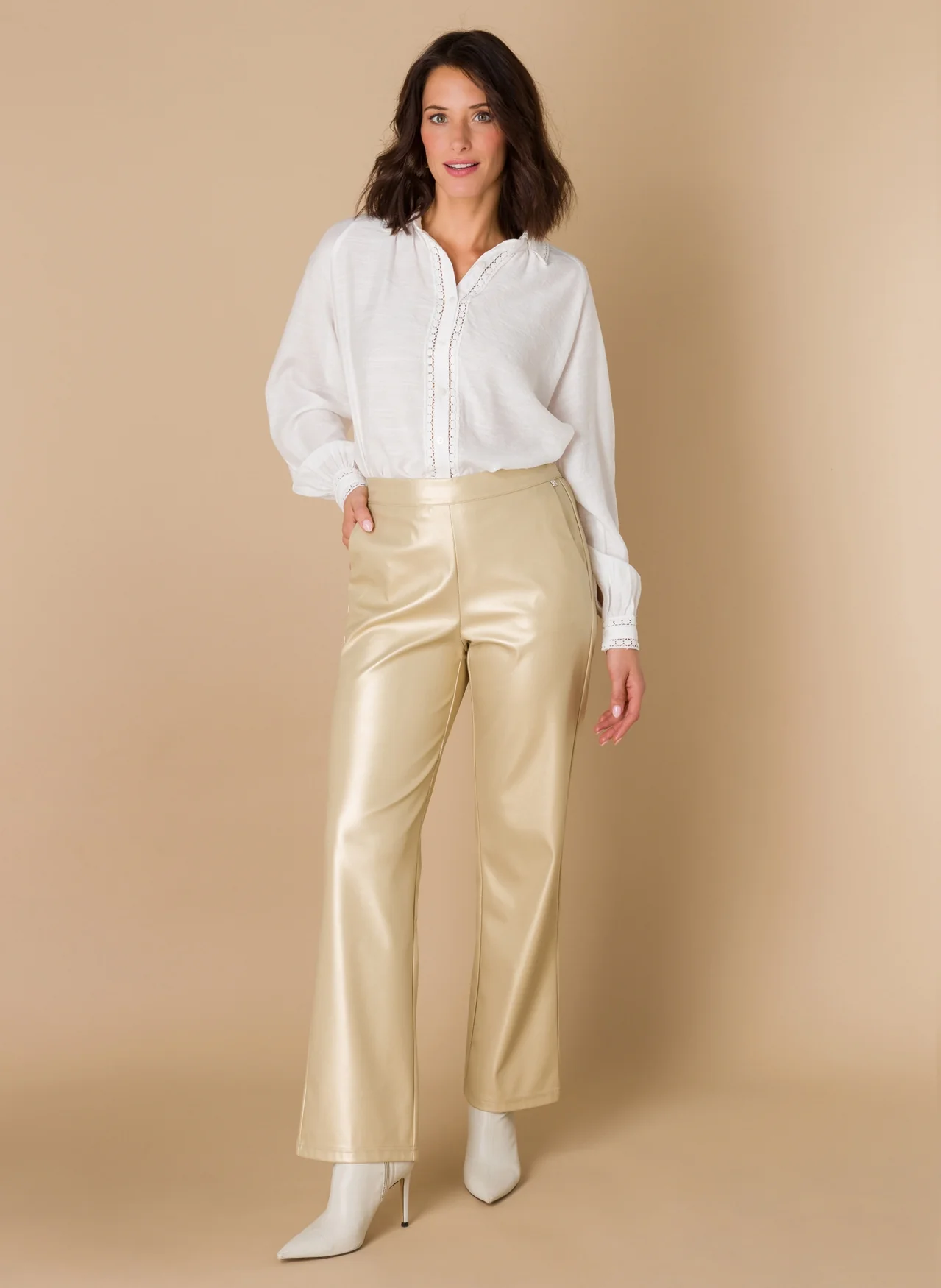Feestelijk en verfijnd! De “Farah” PU broek uit de Ivy Beau winter/party collectie is een elegante keuze voor elke gelegenheid. Met een champagnekleurige coating en een recht model straalt deze broek luxe uit. De elastische tailleband zorgt voor extra comfort. Combineer hem met een satijnen blouse of een feestelijke top voor een glamoureuze party-look.