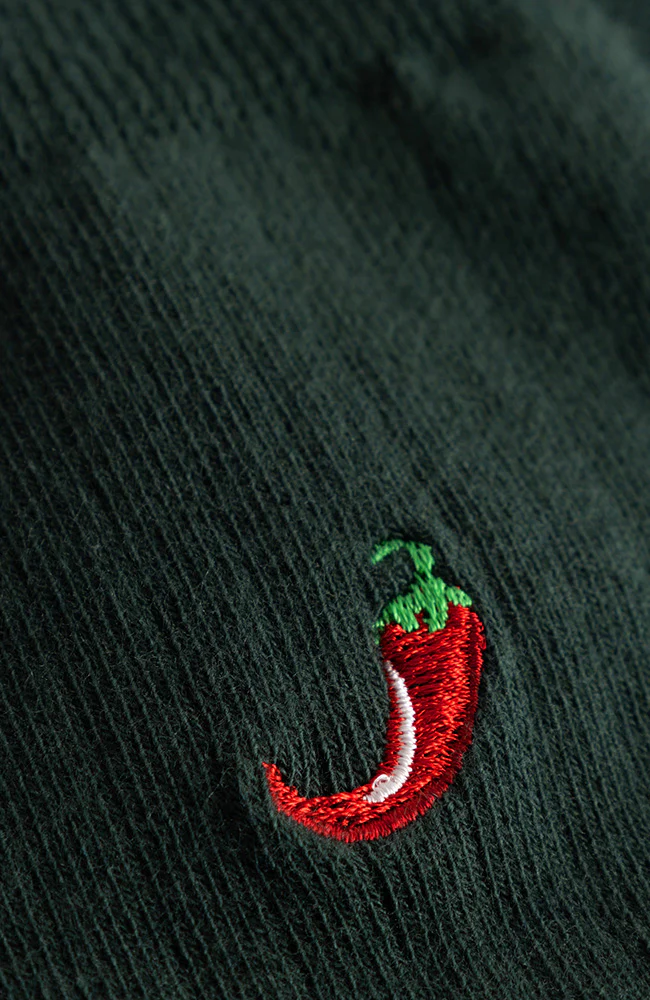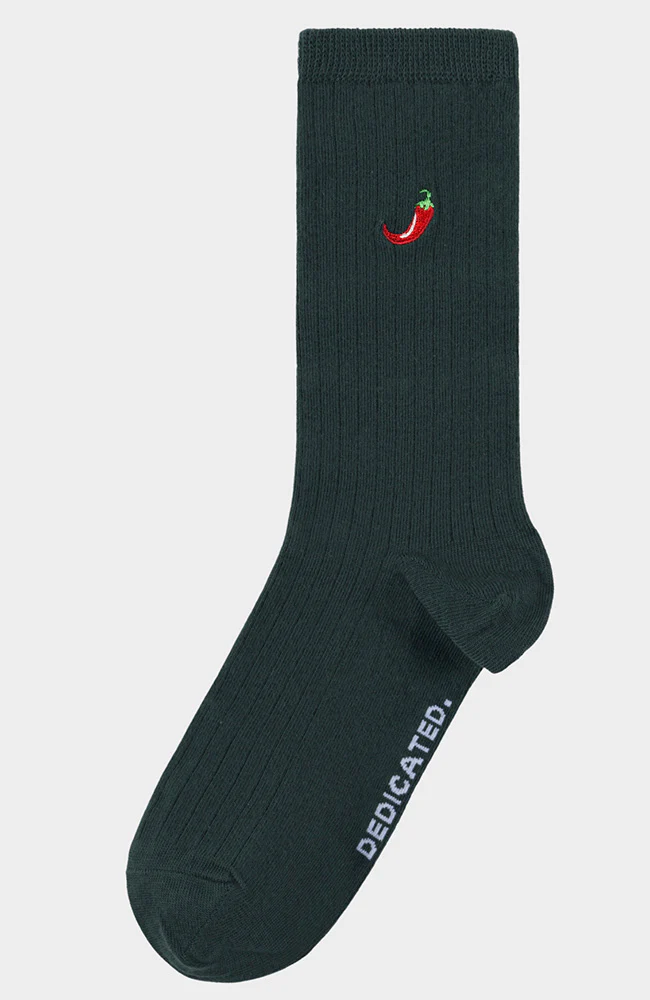 Deze rib sokken van Dedicated zijn donkergroen met een afbeelding van een chili op de enkel. De sokken zijn gemaakt van heerlijk zacht en comfortabel biologisch katoen.