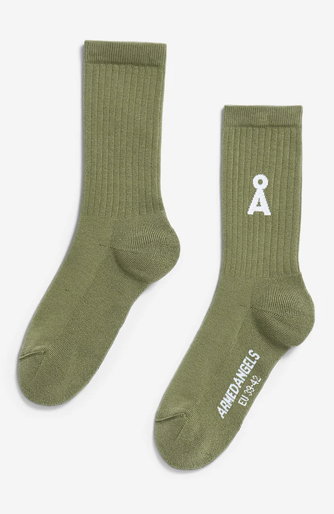 Hippe, groene (fatigue green) sportsokken van ARMEDANGELS een kleine witte A op de zijkant. De sokken zijn gemaakt van duurzaam biologisch katoen.