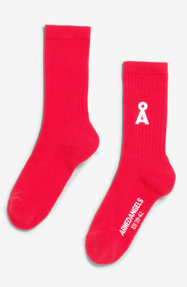 Hippe, knalrode (mars red) sportsokken van ARMEDANGELS een kleine witte A op de zijkant. De sokken zijn gemaakt van duurzaam biologisch katoen.