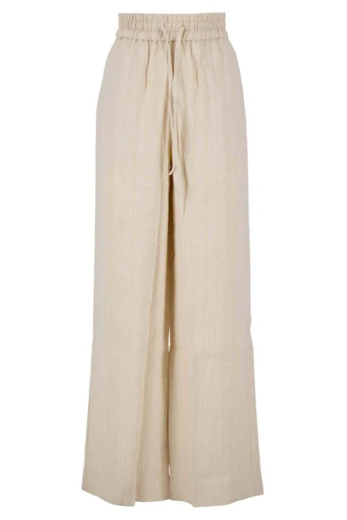 De broek heeft een losvallend, wijd model met rechte pijpen die soepel langs het lichaam vallen. De hoge, elastische tailleband met strikkoord zorgt voor een comfortabele pasvorm en geeft de broek een nonchalante, vrouwelijke look. Dankzij de luchtige stof voelt de broek licht aan en is hij prettig om te dragen, ideaal voor zowel warme dagen als een ontspannen outfit in elk seizoen.